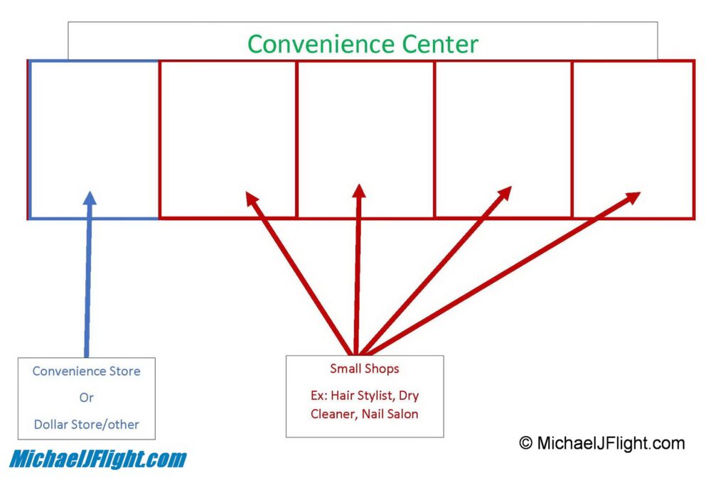 - I mindre butikscentre (strip centers) og power centres er ankerlejere ofte storbutikker eller supermarkeder. Disse centre er typisk udendørs med butikker, der vender ud mod en stor parkeringsplads. Ankerlejeren er her typisk en stor, dagligvare-relateret butik eller en specialiseret storbutik, der dækker et stort behov og dermed trækker mange kunder til regelmæssigt.